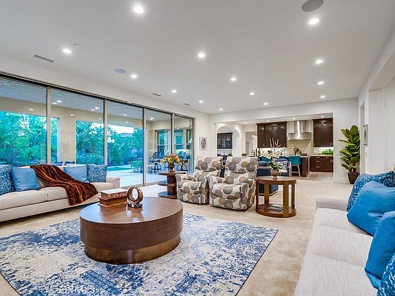 Upon entering through the formal entry to an elegant spiral staircase, the interior boasts two bedrooms downstairs (a 2nd Master's suite w/ a living room + wet bar & an office) & four Bedrooms upstairs, each w/ its own bathroom. The family room opens to the kitchen & features background speakers and a multi-panel sliding door that expands the living spaces by blurring the line between indoors & outdoors, providing an elegant space for entertaining & accommodating large dinner parties.