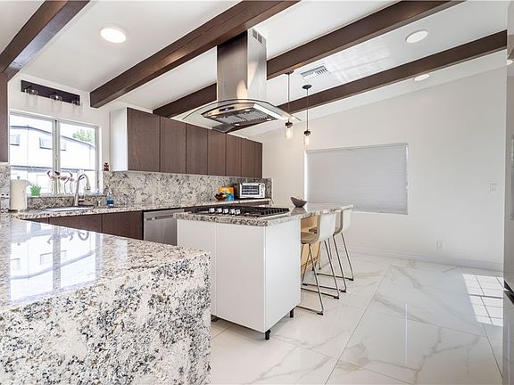 This beautiful Mid-Century home is nestled on a quiet picturesque street in one of Reseda’s most sought-after neighborhoods, and was designed by one of Los Angeles’ most renowned architects, Edward Fickett. Here are just a few of its many other fine features: NEW CUSTOM DESIGNED KITCHEN, NEW MAIN BATHROOM. Mature shade tree, lush landscaping, planters filled with a myriad of rose bushes, and groomed shrubbery you’ll immediately recognize the true “Pride-Of-Ownership” Custom double doors open to a flowing 1,355 square foot open concept floor plan that is in “Move-In-Condition” with HIGH WOOD BEAMED CEILINGS, NEW RECESSED LIGHTING, a designer paint scheme, and the complementary blend of newer laminate and tile flooring. The spacious living room is bathed in natural light from a huge picture window, and complemented by a gas-burning fireplace with custom tiled hearth. Any gourmet cook will truly appreciate the beautifully NEW kitchen’s abundant soft close cabinets, ample granite counters with full back-splash, center island with custom pendant lighting and built-in wrap around breakfast bar, deep basin steel sink with custom faucet, newer built-in stainless-steel appliances, gas cook-top with contemporary glass/stainless steel ventilation hood, plus the convenience of the very large adjoining dining area. A total of 3 bright and spacious bedrooms. 1¾ beautifully appointed bathrooms. Functionally located laundry room. Energy efficient dual pane windows will help keep your utility bills low and the interior very quiet. Central heat & air for year-round comfort. You’re going to appreciate and enjoy the large backyard’s tall privacy fencing, patio, and the 2 very handy storage sheds. Plenty of secure off street parking for all of your vehicles and other toys on the oversized concrete driveway and under the large carport. All of this sits on a large 7,500 square foot lot that’s within walking distance of Melvin Elementary School, and minutes away from the Orange Line Busway, Pierce College, Topanga Mall, The Village at Topanga, and Warner center with its entertainment and myriad of gourmet restaurants.