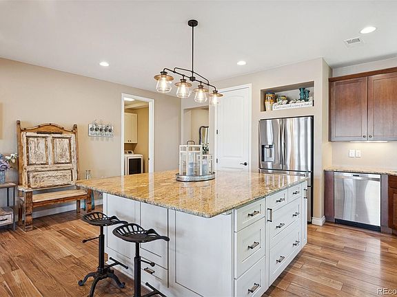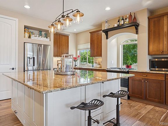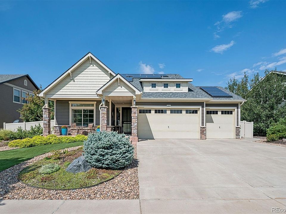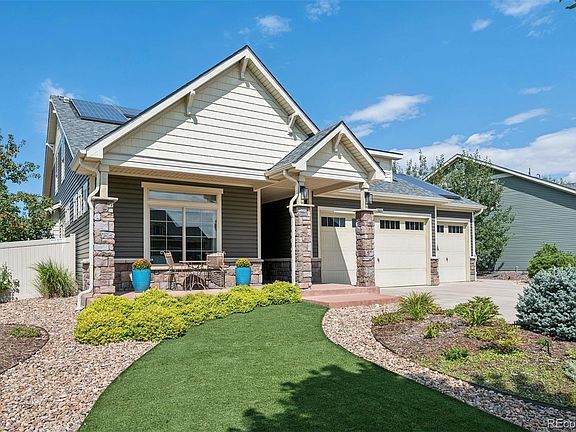 This spectacular home located in the Exclusive 55+ Fairway Villas is meticulously maintained with main floor living and an additional upper level. An Open Concept floor plan flows nicely from the foyer to the rear patio, conveniently combining the Kitchen, Dining area, and Family room, for everyday living and entertaining. The Kitchen is a cook’s dream with high attention to detail and an Island of substantial size including storage - perfect for baking or entertaining. The Kitchen includes exceptional stainless appliances, beautiful warm wood cabinetry, lovely double sink, pantry, and room for everyone. The dining area is centrally located and eases into the spacious family room filled with natural light, views of the rear yard and access to the immense rear patio. The generously sized Primary Bedroom is located off of the family room and features a reading nook, fantastic Spa-like bath, spacious walk-in closet, and access to the rear patio/yard. A huge shower highlights the Primary Bath! Also on the main floor are a Second bedroom, a full bath, and a Laundry room containing cabinetry and a separate storage area. Additionally, there is an upper level with a roomy loft and Third bedroom with an ensuite full sized bath. The spacious 3 car garage has epoxy flooring and storage. Professional landscaping provides amazing curb appeal and an oasis-like rear yard and low-maintenance beauty. There are two outdoor living spaces with a covered front patio and an expansive rear patio. The rear yard has an attractive and calming water feature, turf, serene side yard, concrete sidewalk for easy/safe access, storage shed, and an electric retractable awning offering extra shade, full privacy fence w/gate. Solar power keeps year round electricity costs low. Located close to everything and in a metro district with No Hoa. The community supplies access to the clubhouse, fitness center, pools, golf course, shared garden, extensive walking/biking paths, parks and more.