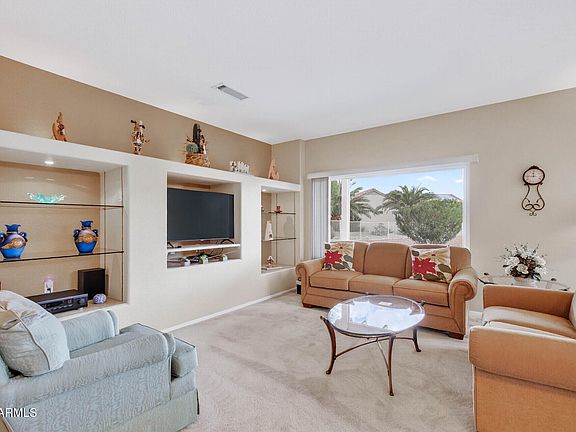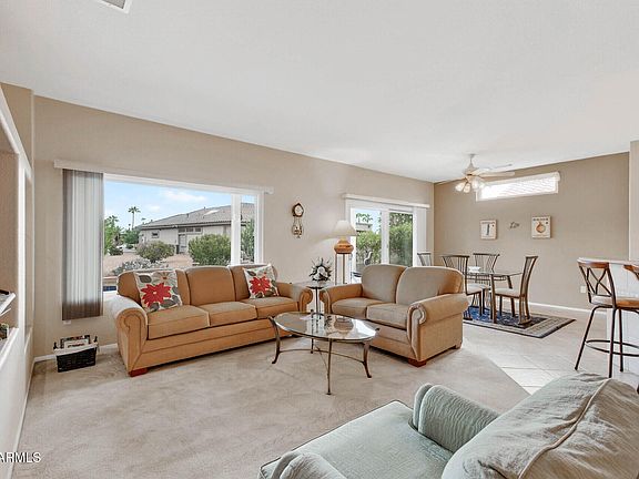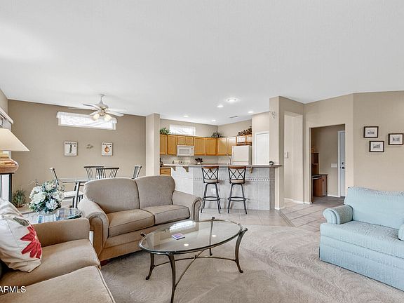 FULLY FURNISHED & MOVE-IN READY. This exceptional 2BD/2BA home offers comfort, style, & functionality. OPEN FLOOR PLAN. The kitchen shines w/granite counters, recessed lighting, & an island with breakfast bar and a stylish tiled kick wall. The Great Room features a custom media wall perfect for displaying your treasures. The spacious Owner's Suite includes a charming bay window for extra seating, an ensuite bath w/dual sinks, & plenty of natural light. Enjoy the EXTENDED 2-CAR GARAGE W/GOLF CART RAMP + 20 amp outlet, cabinets, workbench, solar tube, & updated HVAC (2019). The NEW ANDERSON SLIDER opens to an extended patio w/firepit, seating, & serene open views. Extras include a vacation mailbox, epoxy driveway & walkway, newer PVC irrigation system + NEW ENERY EFFICIENT WINDOWS THRUOUT!!
