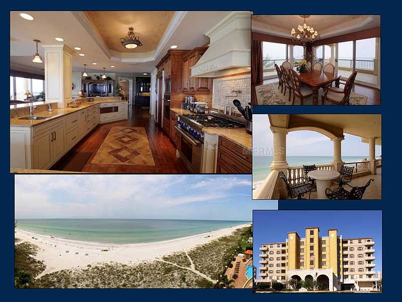 Considered by many to be one of Florida's finest condominium buildings and situated directly on the Gulf Beaches. This 6th floor residence has unobstructed views of the Gulf of Mexico and the beaches to the north and south. This 5,400 sq. ft. condo includes 4 bedrooms (all with en-suites, 2 with private balconies), 4.5 bathrooms, a media room, office, wine cellar, large laundry room, storage room, private foyer, walk-in pantry, 80 ft. wide terrace and your own private 2 car garage. These condos exude luxury with the elevator opening directly into the residence. The expansive gourmet kitchen features stainless steel appliances, granite countertops, 6 burner gas Thermador range, 2 dishwashers, warming drawer, 2 breakfast bars and separate eating area all open to the large living area. The spacious master suite adjoins the office and master bathroom with dual vanities, garden jetted tub, separate water closet, walk-in shower and his and her walk-in closets. The stunning wood floors with marble inlays are complimented by tray ceilings, crown molding, a wet bar, custom built-ins, a gas fireplace, surround sound, electric sun shades, plantation shutters and Venetian plaster walls. The large balcony has a built-in grill and sink perfect for entertaining and enjoying the spectacular sunsets. These exclusive condos have a private pool area all on the beach and the Gulf of Mexico. Close to fine area restaurants, local sporting venues and other area attractions. Quite simply, a must see Gulf front condo!