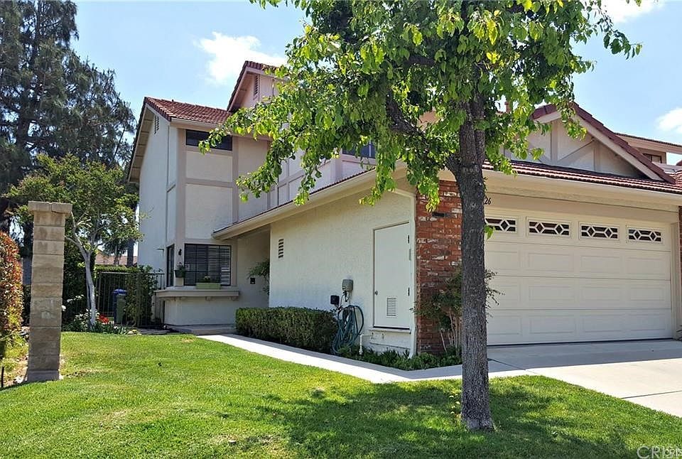 Prestigious Porter Ranch View Estates is a 2-story upgraded home 3 bedrooms, 2 baths located in 24 hour guard gated entry. Situated on a cul-de-sac, this home's upgraded with plantation shutters, recessed lighting, cozy living room with marble fireplace, wood floors, and attached 2-car garage. Glass slider leads to a manicured grassy area and cement patio backyard. Home offers a guest bath located on first floor, separate laundry area, storage cabinets in the garage, smooth ceilings, central air & heat, and skylight on the 2nd floor. Master bedroom offers mirrored wardrobe, 2nd closet with built-in shelves, private bath with dual sink vanity and a combo Grecian tub/shower. Other bedrooms have walk-in closets, ceiling fans, and recessed lighting. The amenities in this gated estate includes 2 pools, spa, tennis courts, basketball & volley ball courts, grassy play area, AND a separate gated dog park! Located near top-rated schools, the new Vineyards shopping center with new restaurants, shops, and Movie theater!