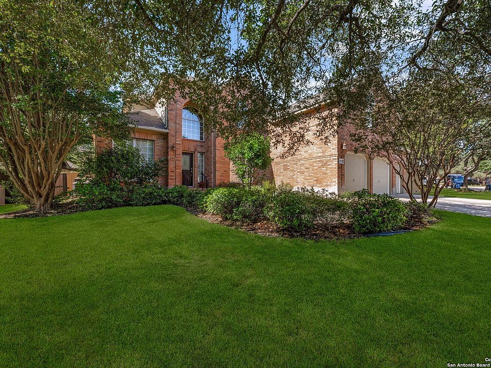 Welcome to this spacious and well-appointed 4-bedroom, 3-bath, 3-car garage home located in the heart of the Sonterra-Stone Oak community. This thoughtfully designed floorplan offers 3 living areas - a welcoming family room, a living room, and a game room, PLUS a study providing flexibility for work, relaxation, and entertainment; the study could also be used as a 5th bedroom. You will find the 3-car oversized garage has plenty of space for vehicles, a workshop, or extra storage. Downstairs, you'll find gorgeous warm wood floors, a cozy fireplace, and a bright dining room perfect for gatherings. The kitchen features granite countertops, a double oven, and ample cabinetry and storage, making it ideal for home chefs, plus a breakfast nook for an additional eating area. A 2nd bedroom downstairs with a full bath lends itself to be perfect for guests or multi-generational living. Retreat upstairs to the spacious primary suite, including a whirlpool garden tub, separate shower, dual vanities, a large walk-in closet, and an additional living area with access to a charming balcony, offering a peaceful spot to unwind. Step outside to a covered patio and a separate flagstone patio area ideal for outdoor entertaining. With 4 sides of brick, this home combines durability with classic curb appeal. Conveniently located near Loop 1604, Hwy 281, the Airport, Shopping, Dining, and the Stone Oak/Sonterra lifestyle, this home offers comfort and convenience in one of San Antonio's most sought-after areas. Zoned for NEISD schools and Reagan High School. Don't miss this exceptional opportunity-schedule your showing today!