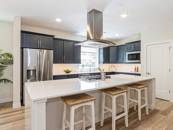 Split-bedroom floor planDesignated beverage stationShaker style maple cabinetsWalk-in closetLarge windowsGas cooktopHerringbone tile backsplash