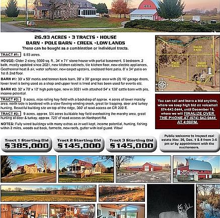 Beatiful, Quiet property with 26.93 Acres to fulfill all your wildest dreams! The sky is the limit with this beautiful property from hosting events/weddings in the beautiful bank barn, to having your own farmet, or hunting right on your own property along Buker Ditch!