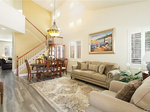 Beautifully upgraded newer 1997 built Cul-De-Sac home. Rare 5 bedroom with a downstairs bedroom! The seller has recently spent tens of thousands on upgrades, including an upgraded island kitchen with quartz counters, glass back-splash, stainless steal sink and appliances, walk-in pantry, and a breakfast area. Elegant grey toned laminate wood look floorings throughout with Custom moldings! The upgraded bathrooms all have white toned quartz style counters, newer sinks, and fixtures along with tile floors. The formal living room has vaulted ceilings and plantation shutters. Great formal dining room with a gorgeous stained glass light fixture. The family room off of the open concept kitchen area features a fireplace, mantel, plantation shutters, builtin cabinetry and a sliding glass door out to the backyard. The master suite has high ceilings, an upgraded bathroom with a separate tub and shower along with a large walk in closet.