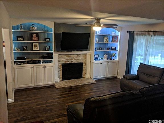 Sweet 4 bedroom, 2 bath home with an office/family room and solar (paid off!) in a great area of Canyon Country. One bedroom and bath downstairs! Beautiful stacked stone fireplace with custom cabinets in living room. Sweet hardwood vinyl flooring downstairs and upgraded carpet in bedrooms upstairs. Newer kitchen with portable island and corian counter tops. Extra office/den adds 200 sq.ft. - all permitted. Large backyard with waterfall, perfect for entertaining. Extra office/storage space (with heating and air) in 2 car attached garage. Large master with 2 closets. Come home to this beauty!