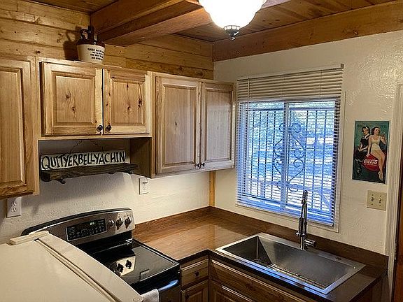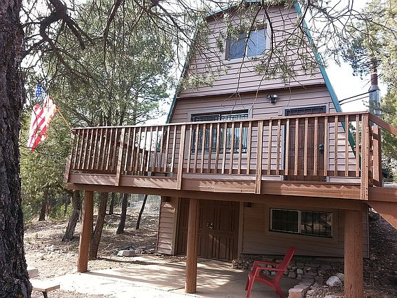 Exceptionally clean, basic and rustic modified A-frame situated on over 1/2 acre that's loaded with pines. Elevated front deck offer quaint views of the surrounding area, the ramada and horse shoe pit. Conveniently located yet at the end of a cul-de-sac for privacy. Laminate floor on the main floor and pine floor in the upstairs portion, both levels accented with beams and knotty pine walls and ceilings. The half basement area is ideal for a washer and dryer, fishing boat, side-by-side or? New metal roof to be installed prior to sale. This is a great, low maintenance get away! At this price you can have your cake and eat it too! Call today for your personal viewing.