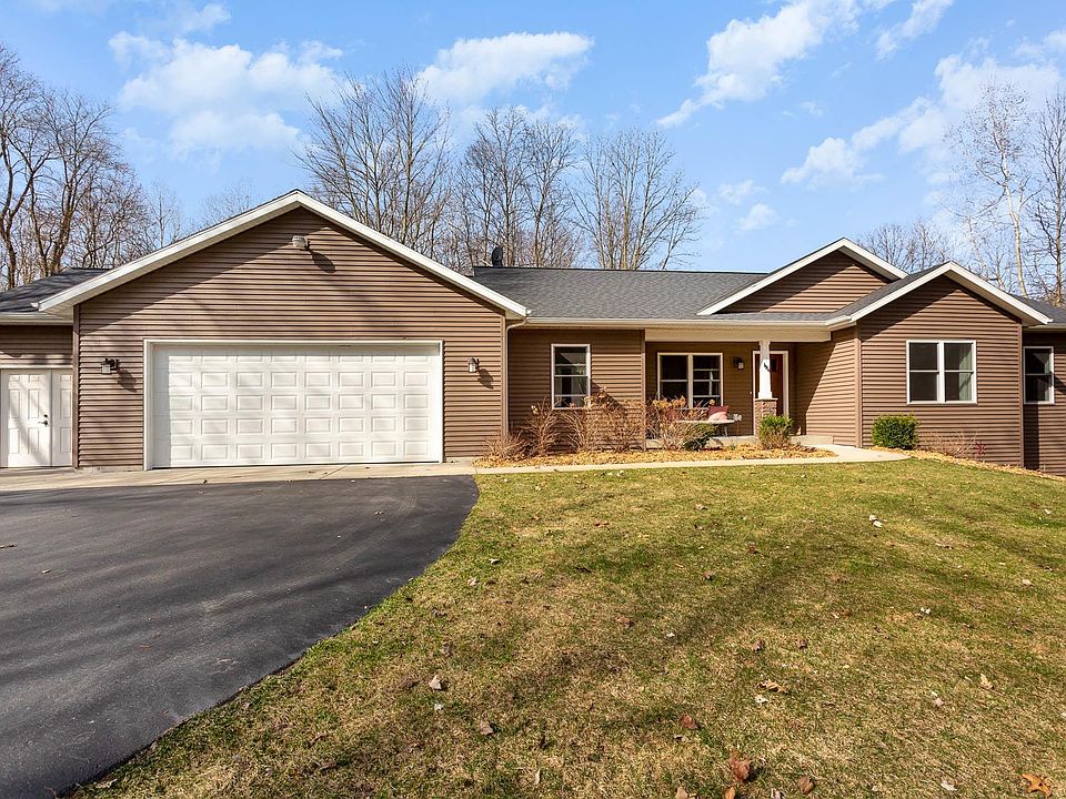 Welcome to 1954 Bella Pines, a diamond within the Lowell school district. Located just outside Lowell on a desirable quiet private drive, is this 3 Bedroom, 2 Bath, Custom Ranch. As you walk in the front door, you'll immediately see the natural light coming into this open floor plan. The living room has great built-ins, and the fireplace has a 150-year-old barn beam for the mantle making it a center piece for the whole house. The bedrooms are down the hall along with Primary Bedroom with it's own private bath. Off the kitchen, towards the garage is the laundry, that is also home to an awesome Hickory and Maple Locker system. Off the other side of kitchen is a Breakfast nook, that you can walk out onto a patio to enjoy morning coffee with the birds. The Walk out Basement is partially finished, with a huge family room and a private office room. Plumbing is there for a future full bath and adding a 4th‚ bedroom would be a breeze giving this floor plan the flexibility for more finished living space. The garage is very generously‚ sized and has the space for storage and a future workshop if wanted. 2 floor drains is also a well thought out touch. Outside there's nature all around as the 2.5-acre wooded lot adjoins around 600 acres of state land where a multitude of possibilities are possible. Hiking, Hunting, Nature, the list goes on and on. Mature Maple trees give plenty of shade, but also the lot has been cleared in areas for a future pole building as well. There is landscaping in all over, perennials along with an irrigation system, a nice cobblestone patio area with fire pit, and so much more! Enjoy nature walking on the trails through the trees or head back on State land for endless adventure. This home offers a 10k watt Generac generator that hooks into a 50 amp in-home wired transfer switch, fiber optic internet, UV air purifier, and so much more. Why build when the upgrades have already been completed and the extra work done for you?