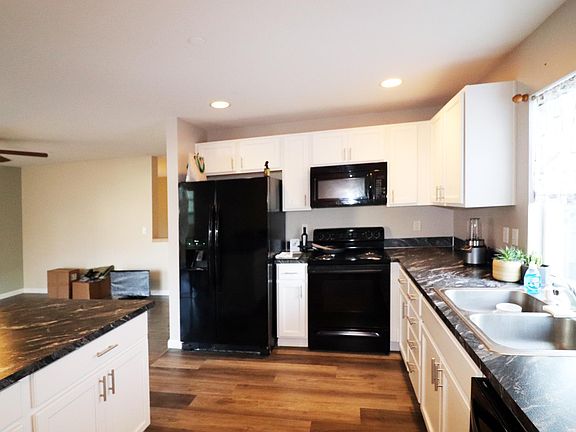 Modern open kitchenVinyl plank flooringFully fenced backyardNew white cabinetsBlack steel appliances