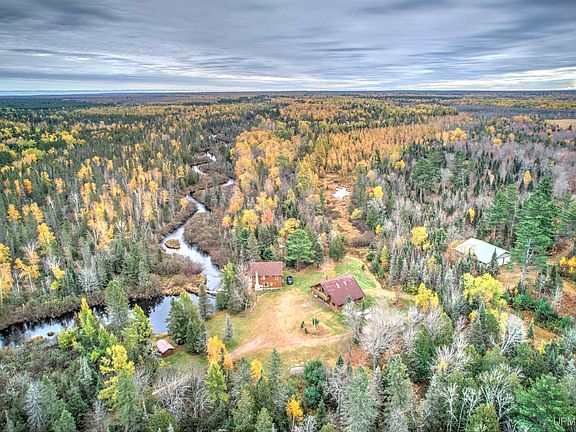 Welcome to Wild River Lodge, a 225-acre Northwoods retreat fronting the North Branch of the Paint River and designed for comfortable, self-sufficient living. Located 11 miles north of US2 just outside of Iron River, MI the two-story, cedar-sided home features warm wood interiors, hardwood floors, and a wall of windows that frame the river and rolling timber. An open living/dining/kitchen layout centers on a wood-burning fireplace with insert—easy to gather around after a day outside. The main floor full bathroom also includes the mechanical room. Upstairs, the primary bedroom offers an expansive space with walk-in storage and river views. Two secondary bedrooms and a half bath with laundry combo offer forest views. A standout amenity is the massive detached garage with a full finished level above—an expansive bonus space with its own gas fireplace. It’s ideal for large groups, retreats, overflow sleeping, or a studio/hobby space. The garage includes workshop area, drive-thru access, high ceilings, and generator/battery storage room. A second large pole barn adds valuable utility with expansive storage (portion with concrete floor - another shop space) for equipment and recreational vehicles. Near the river is a propane heated outdoor sauna that offers a great way to unwind after a busy day! Thoughtfully engineered systems make the property truly off-grid: solar panels, a propane-powered generator, and a small hydro-electric dam supply power; a private well and septic serve everyday needs. The land itself enhances the lifestyle: the parcel borders state and federal public-use land for added elbow room and access, while a trail system spans the property. The Paint River’s north branch flows along the property—ideal for kayaking, fishing, wildlife watching, or simply unwinding beside the water. If you’re seeking a private homestead or a group-friendly basecamp with comfort, craftsmanship, and independence, Wild River Lodge delivers. Check out the 3-D tour.