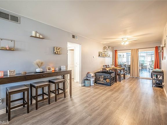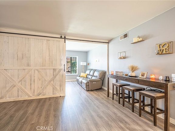Gorgeous Condo in the quiet neighborhood of Anaheim Village III Community. This home has a Bonus Room that can be used  for convenient Office to work from home. It consists of laminate Flooring, 2 bedroom and 2 bath. The large living room  was divided by barn doors, and it comes with a cozy fireplace to enjoy and relax. The kitchen comes with granite counter tops and very conveniently laid out. The  dining area is next to the kitchen and Bonus Room/PERMITTED Sunroom(168 Sq ft). Laundry hookups for full sized washer and dryer. Large master bedroom with private bath, and large 2nd bedroom. Detached 1 car garage and there is an A ssociation pool. Home is  centrally located to great dining, shopping and Disneyland is not far away. This truly has the 3 keys of real estate, Location, Location and  Location. This home may be a condo but it has the feel of Single Family Home due to a private back yard and gate the leads to a small  grassy yard for your pets.