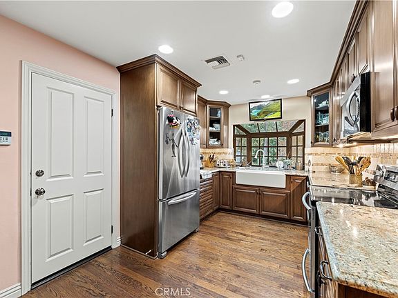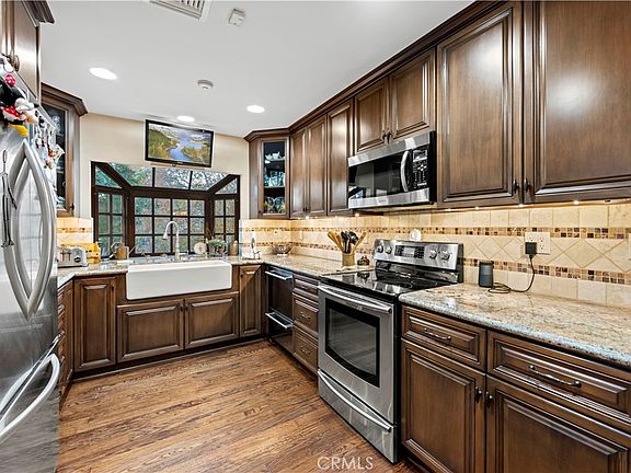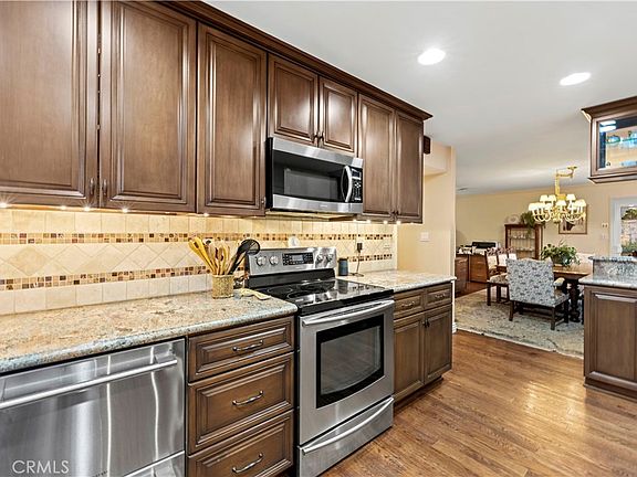 Beautiful home on a quiet cul-de-sac in Porter Ranch, this home has been meticulously cared for by the same owners for over 50 years. Home has been updated and maintained with high-end details such as custom paint throughout, hand-stained hardwood floors, updated kitchen with , farmhouse sink, stainless steel appliances, bay window looking out over the front garden, saltwater pool, and much more. There are 4 spacious bedrooms and 3 baths, a large dining room that opens up to kitchen and living room, with views of back garden and pool area. This home has ample storage space with lots of closets with built-ins. Primary suite opens up to the back yard, has lots of closet space, with not one but 3 closets, all cedar lined. Primary bathroom has custom cabinetry as well as a large dual shower. The home has been designed by a French interior designer and has that European flair, from antique light fixtures to custom antique fabric window coverings.