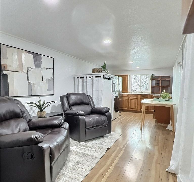 Inside, the open floor plan showcases brand-new electrical, new insulation, and updated plumbing throughout, along with modern finishes. Enjoy new vinyl flooring, double-pane windows, ample cabinet space, and two energy-efficient mini splits for year-round comfort. The home also includes a refrigerator, freezer, and washer, with an additional community laundry room available within the park.