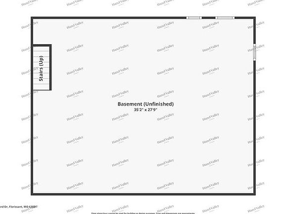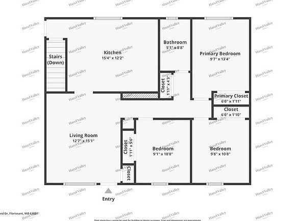 This single-family home in Florissant, Missouri offers 3 bedrooms, 1 full bathroom, and approximately 1,015 square feet of living space. The property features a brick exterior, a covered front porch with red railing, and a concrete driveway for off-street parking.