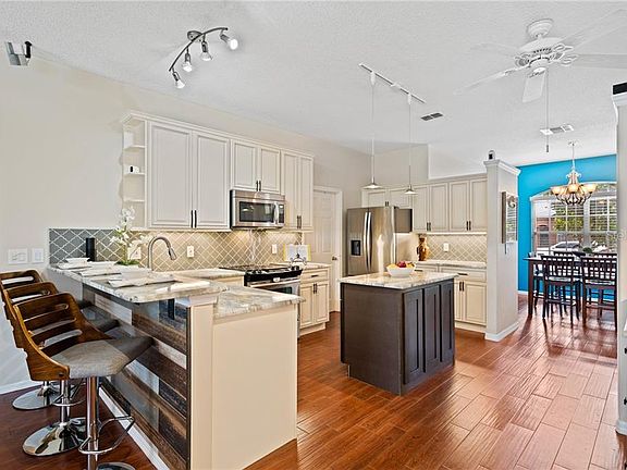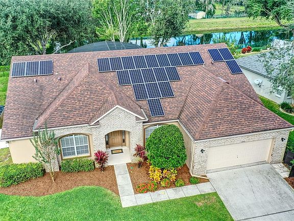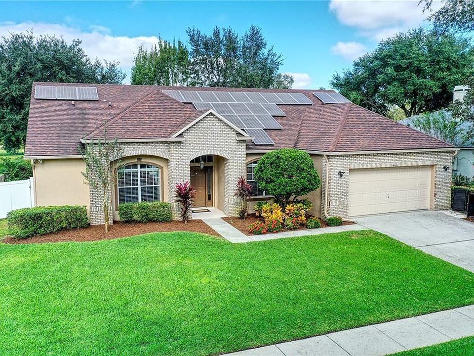 Welcome HOME to this fully remodeled, full brick front with lush landscaping and great curb appeal! Walk into an open floor-plan with 10' ceilings. Immaculate interior w/ updated paint and decor! Covered porch and PRIVATE screened POOL with rock waterfall overlooking a peaceful pond. An oversized RENOVATED eat in kitchen with island includes 42" off-white all wood soft close doors and drawer cabinets and granite countertops. It includes under cabinet and overhead track lighting along with crown and under cabinet light rail for a touch of elegance. This move in ready house includes wood looking tile floor throughout with five year old roof and solar panels. The master bathroom has been renovated and includes his and her walk in closets and his and her hand made custom vanities. It also features a soaker tub and separate glass and tile shower stall. The fourth bedroom off of the entry can be an office / den /study or a bedroom as it does include a closet. The indoor laundry includes added cabinetry above. The 2 car attached garage w/ auto opener includes added shelving. The second bath is a pool bath. Homes roof has been replaced in the last 5 years along with solar panels and 3 year old AC with average electric bill of $50 for the last year, along with new exterior paint and pool deck paint. This house is convenient to 408 / Turnpike / West Orange Mall / Shopping and local restaurants. This home will not LAST, schedule your showing TODAY! Please take our VR 360 TOUR! Seller to pay off solar panels at closing with full price offer.