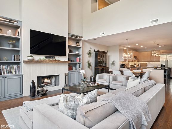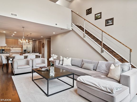 Located on one of Bucktown's best blocks, this stunning 3 bedroom, 2.5 bath top floor duplex UP condo lives like a single-family home. Visually dramatic 20' ceiling height that boasts enormous Palladian styled arched windows are just one of the amazing features of this home. A gas start, wood burning fireplace is a focal point of the main living space and is flanked by custom built-in wood cabinetry and shelving. Glass doors lead to the main level outdoor terrace. Truly, a modern chef's kitchen with high end Viking stainless steel appliances, an expansive granite counter top and island with eat-in counter space. The main level continues with professionally decorated powder room, a 2nd full bathroom, two bedrooms, a laundry room with full size side-by-side WD machines and a laundry sink. The second floor features an open lofted space for a home office or fitness area. Unique French pocket doors open up to a spacious primary bedroom with a walk-in closet and ensuite spa-like bathroom featuring two separate vanities, a private toilet room, steam shower, soaking tub and access to the built-out roof deck. 1955 W. Cortland is a 6- unit boutique building nearby to the 606 recreational trail access, Churchill Park and dog park, boutiques, restaurants, the new Truce coffee and cocktail, the Damen Blue Line, access to 90/94, and grocery stores.
