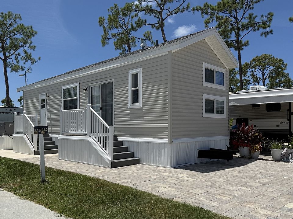 This cozy retreat is ready for you at Sun Retreats Estero Bay! Come join our all ages pet friendly community, just 15 miles from Ft. Myers Beach. This 2021 park model home boasts vaulted ceilings a bright open living area, stainless appliances and 2 bathrooms. The main bedroom has a full closet and drawers with the bathroom just off the hallway. The 2nd bedroom has built in bunks and a full bathroom with a walk-in shower. Call us to view this home today!