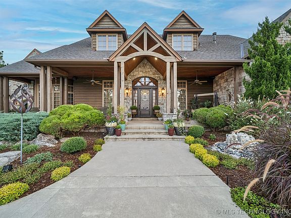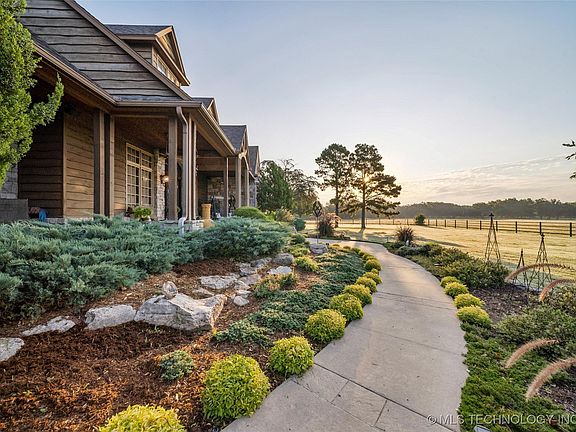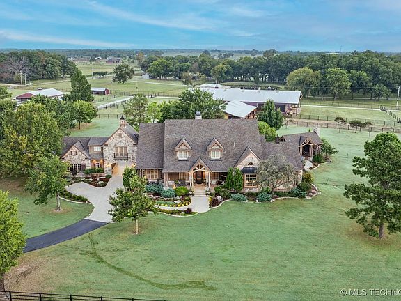 Luxury ranch home on 410± acres in Mounds, OK—5 min to Bixby and 20 min to Tulsa. The 6,848± SF residence (4 BR, 5.5 BA) pairs stone & exposed beam styling with vaulted ceilings and rich finishes: 3" hand-scraped wood floors, solid beams, extensive trim/crown, Giallo Beach granite kitchen with KitchenAid appliances, Rainforest granite bar & butler’s pantry, polished nickel faucets. First-floor owner’s suite with fireplace; upstairs bedrooms each with private bath; office/4th BR with private bath and walkout balcony; theater room; 4 fireplaces; instant hot water; crushed-ice maker; speakers throughout downstairs. Insulated doors/windows, 3 bay windows, Culligan filtration, 21-zone irrigation. Outdoors: covered patio with fireplace & cooking area, professional landscaping, two 2-car garages, saferoom, Generac generator.