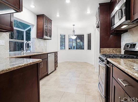 Updated & Remodeled to Perfection!! Gorgeous Porter Ranch Estates Garden Home situated on a desirable cul-de-sac on a nice sized lot with great privacy. Home featuring 4 bedrooms (4th bedroom downstairs converted to den), 3 updated bathrooms (1 downstairs), a spacious living room with a cozy brick fireplace and dining area. Remodeled Cooks kitchen with granite counter tops, stone backsplash, quality cabinets with soft close drawers and pull-outs, plus a convenient breakfast area with bay window. Primary suite offers a walk-in closet and en suite private bath with dual sinks and large walk-in shower. Ample sized secondary bedrooms and hall bath. Low maintenance rear yard with brick trimmed patio is perfect for relaxing, BBQs and dining Al Fresco. Additional amenities include: Central air & heat, newer dual pane windows, smooth ceilings, wood laminate floorings, indoor laundry room, direct access 2 car garage, community pool, spa, tennis courts, playground and 24 hour guard gated. Located in high demanded Castlebay Lane Charter School District! Near hiking trails, parks, easy access to 118 freeway, plus dining, entertainment and shopping at the new Vineyards at Porter Ranch.