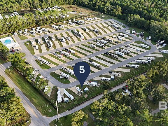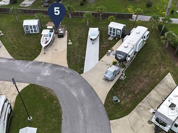 Lot #5 offers a prime location near the front of Whispering Pines RV Resort West with excellent maneuverability and generous space for your RV, boat, or extra vehicles. This easily accessible lot includes a 10 x 12 storage shed that conveys with the property—perfect for storing beach gear, tools, or outdoor equipment.Whispering Pines is an upscale RV resort completed in 2021 featuring 93 large concrete pads, each with separately metered utilities for electricity, water, and sewer. Resort amenities include a resort-style saltwater pool, fenced playground, clubhouse with full kitchen, clean showers and bathrooms, laundry facilities, and high-speed fiber internet with park-wide Wi-Fi and streaming cable.Located just minutes from Gulf Shores Public Beach, OWA Amusement Park, Tanger Outlets, and The Wharf entertainment district, this resort offers comfort and convenience with easy access via Baldwin Beach Express ? Foley Beach Express ? County Road 8. HOA dues of $175 per month include water, sewer, trash, cable/internet, landscaping, pest control, and pool/common-area maintenance. Short-term rentals are permitted. Buyer to verify all information during due diligence.