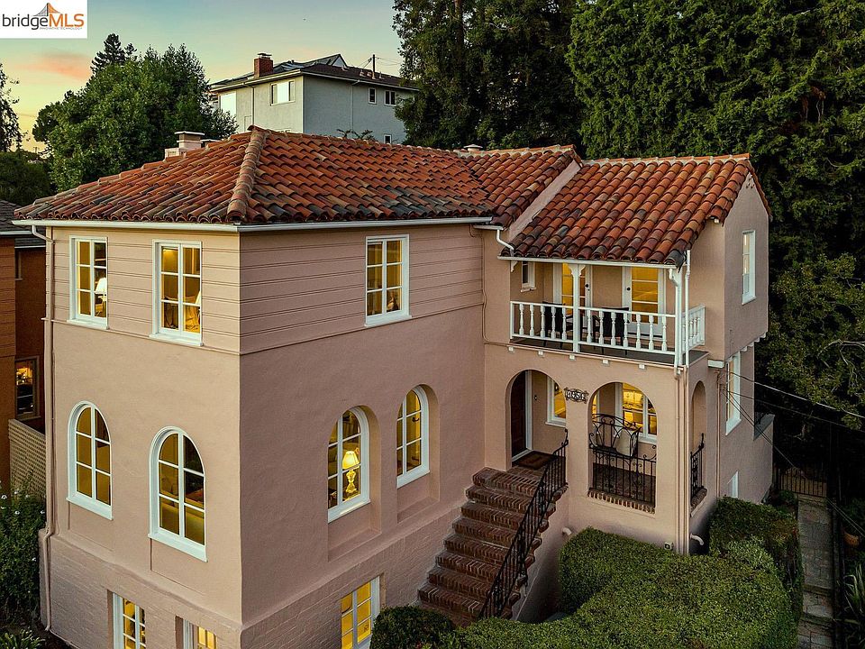 Commanding Oakmore Mediterranean with dramatic Bay views. Classic architectural details abound throughout this gem. The formal living room’s arched windows frame spectacular vistas and fill the space with natural light. Adjoined is a beautiful formal dining room with a cozy deck perfect for dining al fresco. The eat-in kitchen has been thoughtfully remodeled to provide ample space for the chef to create while attending to family and guests. French doors open out to a simply stunning backyard urban oasis. Upstairs, enjoy three bedrooms all on one level. The hall bathroom showcases a striking vanity with a waterfall countertop. In the primary suite, multiple windows frame views from many vantage points. An en-suite bathroom with an oversized shower completes the experience. On the lower level, enjoy a spacious family room and a full bathroom. A detached garage provides space for the home’s solar panels. The professionally designed backyard is breathtaking with connecting patios for relaxing and dining. Easy to shops, restaurants and transportation.