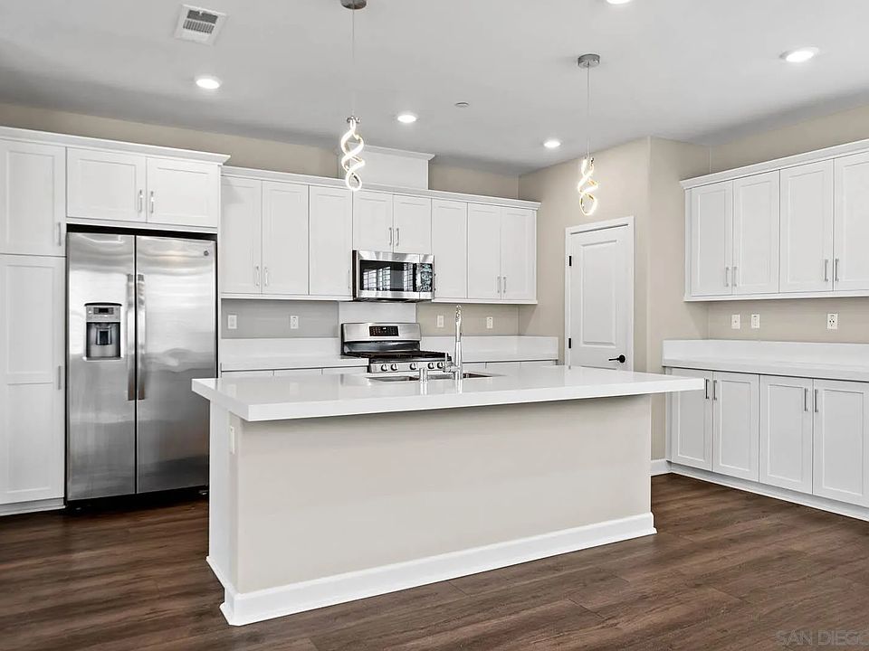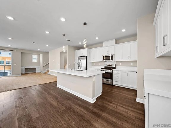 Experience modern living in the heart of Millenia! This dynamic community places you within easy reach of parks, promenades, shopping, dining, and everyday conveniences. Step inside this beautifully upgraded end unit rowhome featuring 4 bedrooms and 3.5 bathrooms—including a private first-floor bedroom and full bath, perfect for guests, in-laws, or a home office. Designed with both style and function in mind, the home boasts luxury vinyl plank flooring, custom fixtures, and a bright, open-concept floor plan. The sleek kitchen showcases white cabinetry, quartz counters, a spacious island, and stainless steel appliances, making it the true centerpiece of the home. The top floor includes three additional bedrooms, highlighted by a generous primary suite with walk-in closet and spa-like bath offering dual vanities and a soaking tub. Energy efficiency comes built-in with solar, while an attached 2-car garage and in-unit laundry add everyday convenience. Community amenities include a sparkling pool, relaxing spa, and multiple play areas. All of this just across from Otay Ranch Town Center, with nearby trails, Otay Lake, and exciting new dining options like Common Theory Public House and Sura Korean BBQ just minutes away. Don’t miss your chance to own in one of Otay Ranch’s most vibrant neighborhoods!
