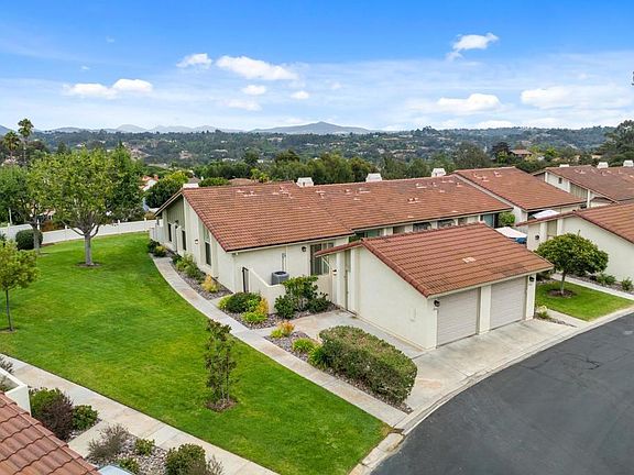 Delightful 3br/2ba end unit in the sought after "High Country Villas" neighborhood...a 55 age restricted community. This unit is set far apart from the next building with an abundance of green space & trees. Take a look at the amazing mountain and countryside views! The main patio features an "Alumawood" cover so you can enjoy the patio year round. Vaulted ceiling in the living & dining room. Gas fireplace in the living room for those chilly evenings. Upgrades include newer dual pane windows, A/C & furnace, water heater and plantation shutters on all windows. Second patio is located off the primary bedroom. Walk-in closet in both bedrooms. Detached single car garage with one reserved space next to it. Great community amenities...9 hole golf, clubhouse, pickleball, bocce ball, 2 pools & 2 spas. Conveniently located to shopping, restaurants and Moonlight beach!