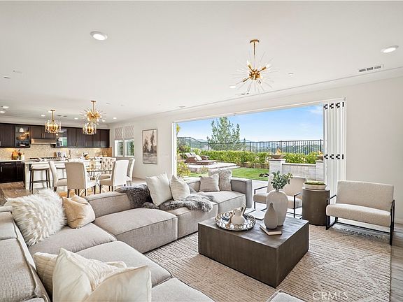 Stunning Panoramic Views from the moment you enter this magnificent luxury home in the prestigious community of Plum Canyon! This 4,200 SF executive home with 5 bedrooms, Den, and Loft & 4.5 baths boasts a modern luxurious open floor plan with high end designer upgrades throughout including designer tile, quartz counters, custom glass tile backsplashes, crown moulding, and modern chandeliers. Enter this home and be amazed by the incredibly open and spacious dining room, great room, designer kitchen and nook which all view out to a sweeping view of the valley and the mountains. Entertain friends and family when you open up the magnificent 18 foot accordion doors facing the tranquil waterfall fountain with dramatic fire bowls and panoramic views to enjoy indoor/outdoor living at its finest. The stunning Chef's kitchen has a large quartz island open to the nook and great room, and features opulent designer tile backsplash, a double oven, stainless appliances, a butlers panty, and a walk-in pantry. The downstairs Flex room currently used as an office has an attached full bathroom and can be converted into a bedroom, mother-in-law suite, guest room, or play room. There is also a gym downstairs which can be used as a 6th bedroom with the addition of a closet. Upstairs there are 4 spacious bedrooms, all with their own generous walk-in closets. The spacious Master Suite features two walk-in custom closets with designer cabinetry. The larger and oversized master closet is a one of a kind dream closet designed with gorgeous custom cabinetry to feature all of your handbags, shoes, and clothes. The Master bath has beautiful modern quartz and designer glass tile with a separate shower and tub with double sinks and a make-up vanity. Upstairs there is also a large loft/bonus room perfect for a Media Room or Game Room, and a laundry room with a sink and cabinets along with two more full baths. 2 Car attached garage with epoxy floors and lots of storage. No expense spared with designer window treatments and chandeliers, tankless water heater, fully paid seller owned Solar, wrought iron staircase, gorgeous landscape/hardscape, and a beautiful backyard oasis. NO MELLO ROOS and low HOA dues! HOA amenities include a resort like pool community pool/spa just walking distance from the home. Conveniently located within walking distance to a charming shopping center with restaurants, coffee shop, and a grocery store.