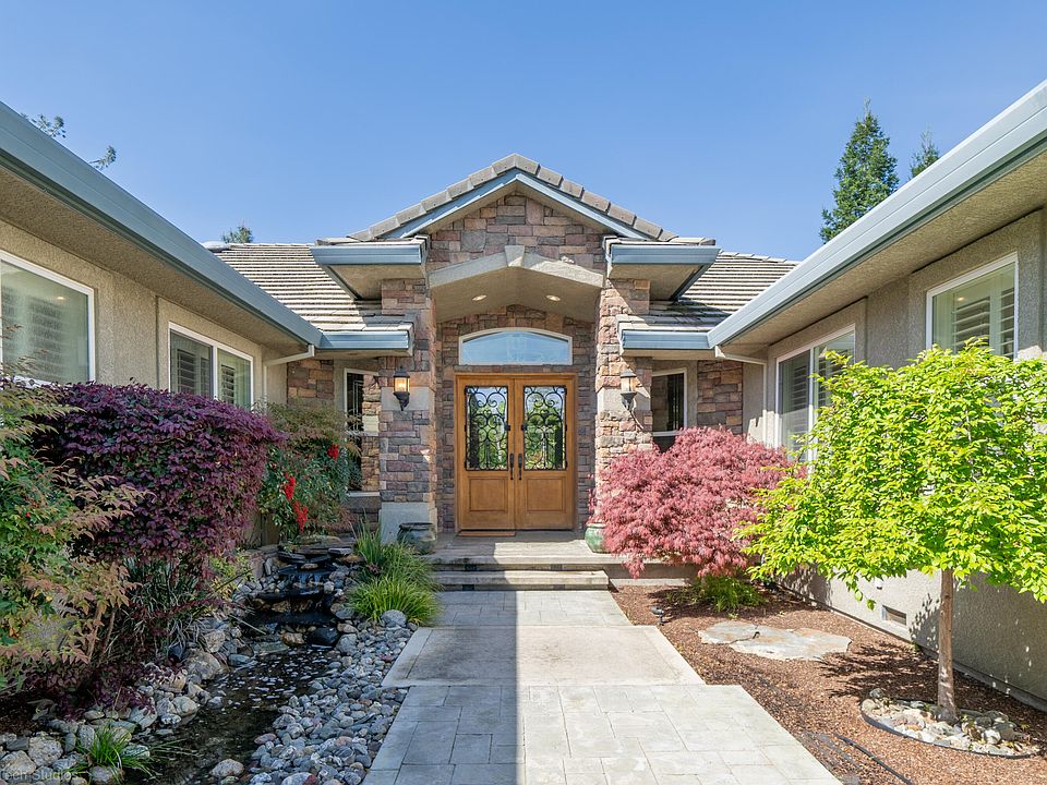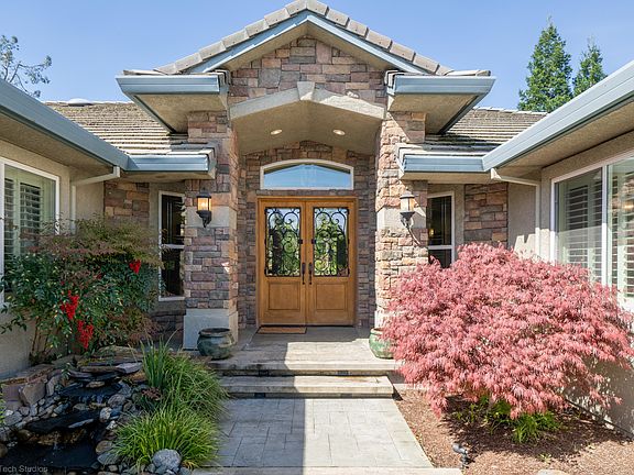 Redding's most sought after Golf Course Gated Community. Custom homes, wide private roads, minimum 1/2 acre lots and Redding's least expensive utility combo, make this stunning private community a destination location for all upper-end Buyers. This custom home offers ALL the bells & whistles an upper-end Buyer could ever dream of. From the moment you drive up to the horseshoe driveway & step into the exquisite courtyard with it's own private waterfall and stream, and walk up to the HEAVY 8 foot custom double iron doors, you are blown away by the sheer elegance of this completely custom 5 bedroom/5 bath home! 4,350 sq. ft. AND 90% of it is one story. Huge Primary Suite with its own private fireplace, his and her's closets a huge custom 2 person multi-spray walk-in shower. A private Guest Suite next to the stunning swimming pool and builtin hot tub. Even and outdoor kitchen and two private covered patios. Two large grassy areas for playing. An HVAC system on each side of the house. All upper end appliances in the gourmet kitchen and large granite island with breakfast bar seating. Even a separate little wine storage room. There is also one surprise Bonus Room located upstairs so overnight guests have their own private space to relax in, or the kids can all hang out! First Class all the way on this house!
