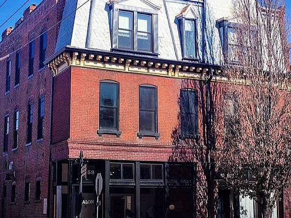 Commercial space unitsChic backyard patioSlate-covered mansard roofDecorative brick workShared laundrySituated on the cornerFull basement with storage