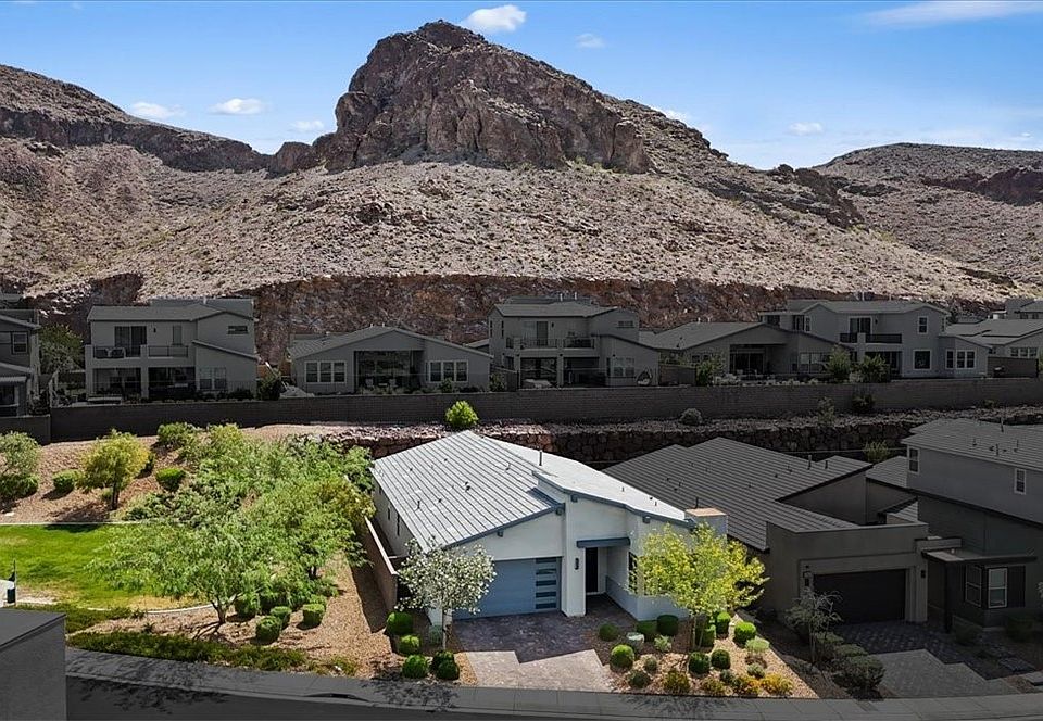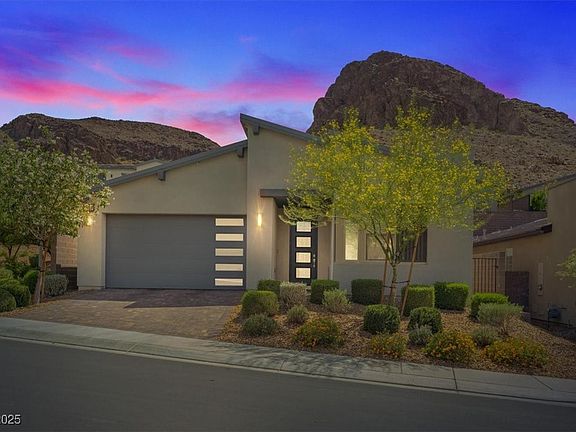Modern elegance meets thoughtful design in this 3-bedroom, 3-bath single-story home in Midnight Ridge. The living room features custom cabinetry and a sleek stacker door that opens to a private desert-landscaped yard. The kitchen is finished with a stylish backsplash, GE appliances, and window coverings throughout. Enjoy smart living with pre-wired surround sound, outdoor speakers, and camera-ready security. The 2-car garage includes electric vehicle hookup, while the primary bedroom & bath offers a tranquil mountain view, with an oversized spa-like shower retreat. Blending style and function, this home delivers quiet sophistication on a corner lot in a gated Henderson community close to top schools, shopping, freeways, and recreation.