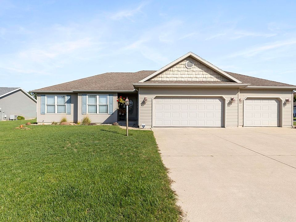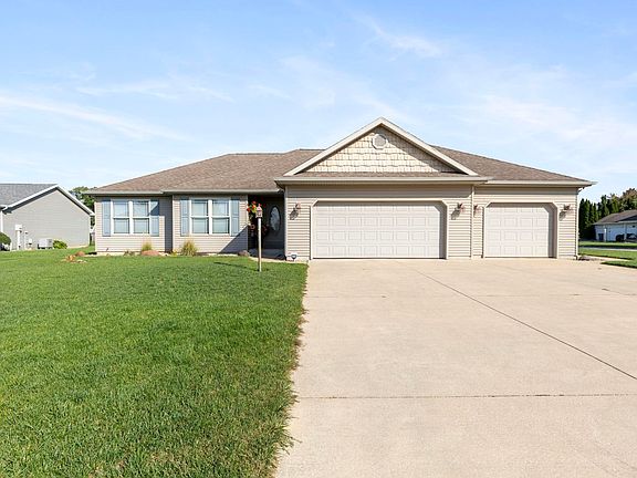 Step into this stunning 3-bedroom, 2.5-bath home featuring new hardwood floors and an open, inviting layout. The great room boasts vaulted ceilings and flows seamlessly into the kitchen and oversized dining area. The kitchen comes fully equipped with appliances included, a breakfast bar, and a large pantry offering abundant storage. From the dining area, sliding patio doors open to the patio and spacious backyard, complete with an irrigation system and a RID-O-RUST system to keep your landscaping lush and beautiful. Enjoy peace of mind with a new HVAC system (2019) with humidifier and a split-bedroom floor plan. The spacious primary suite includes a walk-in closet and private bath, while main-floor laundry adds everyday convenience. The basement offers tons of potential, with space to add a fourth bedroom and already includes a half bath and plumbing rough-in for a full bath.