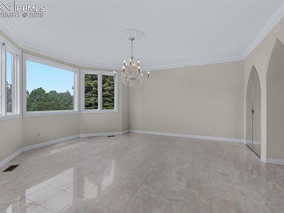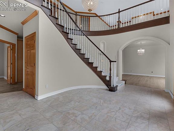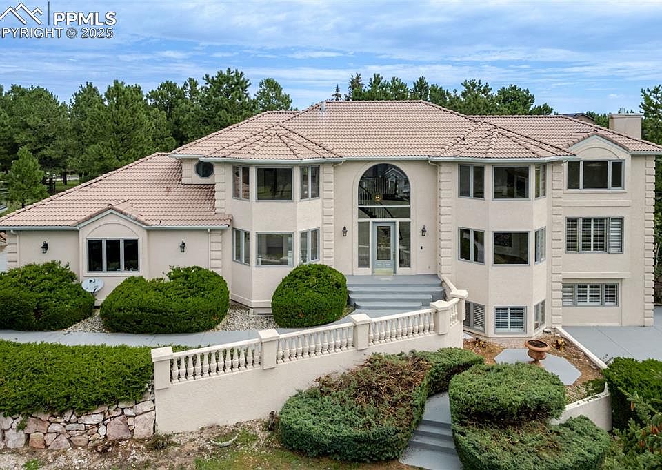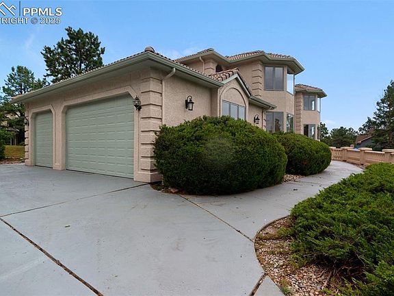 Majestic custom home in Woodmoor Highlands II with breathtaking Pikes Peak views from nearly every room! Step into a grand marble-floored entry with a sweeping circular staircase & dramatic window framing the mountains. Formal living and dining rooms offer elegant finishes and panoramic vistas. Formal Living Room Is Carpeted, Formal Dining Enjoys Beautiful Marble Floor. The gourmet kitchen features natural wood floors, quartz countertops, a large center island, walk-in pantry, and spacious counter bar. Adjacent is a casual dining area overlooking the backyard. The formal dining room (15x17) boasts marble floors and abundant windows, with Pikes Peak Views. Three family rooms—one on each level—each include a cozy gas fireplace. The main-level family room has a large stained glass panel in wall and double doors open to the backyard and deck, perfect for entertaining. French doors lead to a private office with its own private door access to 2nd deck. Main-level laundry includes washer dryer, cabinets, sink & counters. Upstairs, enjoy a loft-style family room with fireplace and stunning views. Two master suites feature walk-in closets and private baths, including a jetted tub & multi jetted shower in the primary. Two additional bedrooms, jack-n-jill, complete the upper level. The walk-out basement offers a media room with projector and screen, a dance floor & a custom wet bar with granite tile counters & backsplash and built-in fridge. One more large bedroom a spacious mechanical/storage room add flexibility. Oversized 3-car garage (21x32) fits vehicles and a golf cart at the same time. Central air central vacuum included. Recently renovated to restore its original grandeur, this home stands out as a true gem—elegant, spacious, and filled with natural light & Pikes Peak Views. As you turn the corner on Misty Morning and you see this home, you'll say, "Wow!" Located close to the main city of Colorado Springs, Monument, Castle Rock and about a 30 minute drive to Denver.