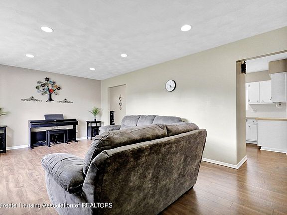 Just imagine a move-in ready home in the Holt School District with space and flexibility for working from home, play space, and guest spaces. Enter the home from a cozy covered porch into the living room with a sunny picture window and hardwood floors. The kitchen features ample cabinets with fresh white paint and loads of countertops and newer flooring. The new flooring flows into the dining space.