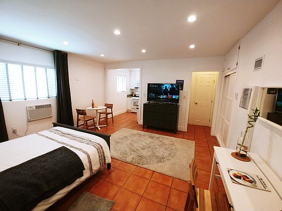 Completely remodeled & furnished Studio apartment. This apartment features a brand new kitchen with new cabinets, new granite counter top, stainless steel sink, built in microwave hood, bottom freezer refrigerator, and a matching stove. The apartment is offered as a short term rental with a minimum 30 day lease. It is fully furnished with a queen sized bed, firm mattress, bed linens, pillows and towels. Kitchen is fully equipped with everything necessary to prepare meals; silverware, plates, coffee maker, hot water kettle, paper towels etc. Bathroom is fully equipped with towels, shampoo, body soap and toilet paper. The space has WiFi and a large flat screen TV with free Netflix. All utilities are included. Parking is available on a first come first park basis with a limit of one car. Street parking will occasionally be necessary if all the spaces are taken. Applicants need to fill out an application and provide proof of income. Stated rental rates is for one occupant. Additional occupants are 10% more. Good credit is a must. One year lease. First month's rent plus one month security deposit required for move-in. Good to decent credit a must. Please call to set up a viewing of the apt.