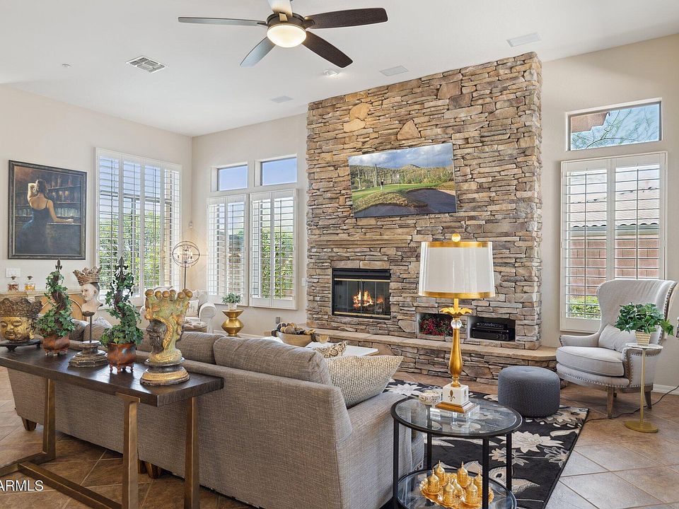New price on this amazing Bennington model on a spacious quarter-acre lot with view fence to a lush wash behind home. Located in the gated enclave of Anthem Country Club, this warm, inviting home features granite kitchen counters, beautifully refaced cabinets, and a generous great room with den/office. The primary suite offers backyard access, while the guest en suite provides comfort and privacy. Perfect for entertaining, the backyard includes an extended covered patio, built-in BBQ, and gas fireplace. Recent upgrades: 2021 HVAC, 2022 carpet, paint, and cabinetry. Primary bath has been refreshed with new shower, new lighting, fixtures and painted cabinets. Enjoy resort-style living with golf, tennis, pickleball, fitness, dining, and more! This is a must see home!