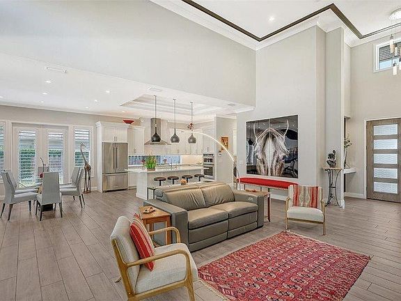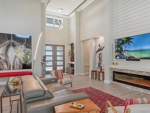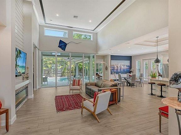 An exceptional single-story Allegra home in Sarasota’s coveted West of Trail Flower Streets, perfectly positioned within the Southside School district and just steps from the charming Southside Village restaurants, shops, and Morton’s Gourmet Market. This impeccably designed 3-bedroom + office + bonus room, 2.5-bathroom home epitomizes modern coastal living and showcases the esteemed Kristi Ann single story floor plan, offering a seamless blend of sophisticated design and everyday functionality, making it an ideal primary or seasonal residence. From the moment you step through the double doors, you’ll be captivated by the open and inviting main living space. The soaring 18-foot ceiling and wall of expansive 10-foot pocketing sliders draw you towards the resort-like outdoor retreat, perfect for relaxing or entertaining. The living room is a true architectural masterpiece, featuring a dramatic floating tray ceiling with Halo-LED lighting and a focal wall complete with a remote-controlled electric fireplace. The chef's kitchen is as functional as it is stylish, equipped with stainless steel appliances, a 5-burner gas range, Quartz island and countertops, and a generous walk-in pantry. The dining area, both intimate and elegant, includes a built-in Quartz-topped buffet, creating a serene space for family meals or hosting guests. The primary suite offers a tranquil escape, with vaulted ceiling accented by charming wood beams. The spacious custom walk-in closet ensures ample storage, while the spa-like en-suite bathroom, featuring glass-enclosed shower and designer tile, is the perfect respite after a long day. Two additional large guest bedrooms, along with a well-appointed guest bathroom and powder room, offer comfort and privacy for family or visitors. This award-winning floorplan also boasts a dedicated office, versatile bonus room, laundry room, and a 2-car garage with added storage, meeting the needs of modern living. Step outside and discover an expansive lanai with a resort-style heated pool, spa, and impressive summer kitchen, all surrounded by lush landscaping and illuminated by custom lighting. The disappearing corner sliders seamlessly blend indoor and outdoor spaces, offering the quintessential Sarasota lifestyle. This home is packed with custom features, including designer lighting and built-ins, PGT impact windows, solid-core interior doors, and spray foam insulation for optimal energy efficiency. Recent upgrades include remote-controlled Kevlar shades for additional hurricane protection/storage for outside furnishings/sunshade, new AC unit with UV lights, 2023 mini split AC unit in the garage, and a whole-home in-duct air purifier, ensuring comfort and peace of mind. This impeccably crafted residence captures the essence of Southside Village living, offering a single-level floor plan that balances everyday comfort with refined style. Ideally positioned near Southside School, Sarasota Memorial Hospital, Downtown Sarasota, and Siesta Key Beach, it delivers the ultimate blend of location, luxury, and lifestyle. Built to the latest hurricane codes and outside the flood zone, the home provides peace of mind along with timeless design. Every detail has been thoughtfully curated, creating an exceptional opportunity for discerning buyers to experience the best of Sarasota living in a true single-story gem.