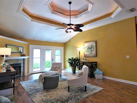 Thoughtfully designed to allow living at its best, this 4 bedroom/2 bath home is perfectly located in the well-established North Ridge Creek subdivision complete with underground utilities. Situated on a quiet, low traffic corner lot, this open concept split floor plan provides sight lines from the centrally located kitchen to both the family and dining rooms - great for entertaining. The kitchen features a breakfast bar, center island work space, solid surface counter tops, custom lighting, and a pantry. The large family room has a 10 ft trayed ceiling with accent lighting, a gas fireplace with glass tile surround, lots of crown molding and French doors leading to a great patio area. The dining room is spacious enough for large furniture pieces and has chair