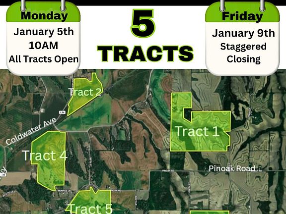 LAND AUCTION - ONLINE ONLYBIDS OPEN JANUARY 5TH, 2026BIDDING CONCLUDES JANUARY 9TH, 2026Eye appealing tract of land with excellent stocked 4-5 acre farm pond! Fenced with pasture. Farm also features a machine shed, cattle working facility. Ideal home building sites. Property could accommodate up to 7 homes subject to NRCS watershed rules. Sells subject to a cash rent lease for 2025. Full possession for 2026.Tax Parcels: 764308100012; 764308100015; 764308100016; 764308300006; 764308200009; 764308400001