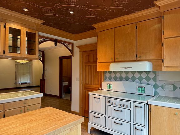 Classic fixturesBack porchCraftsman woodworkCustom tileMetal ceiling tilesHardwood floorsBeautifully detailed kitchen