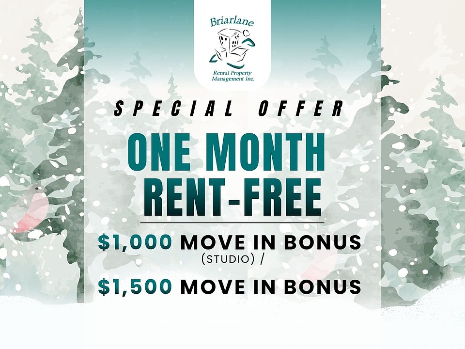 - Special offer! First Month Rent Free! - Receive your FIRST MONTH RENT FREE! This limited time offer is available for new applications on select suites with a 13 month lease term. Contact our leasing agent for further details!