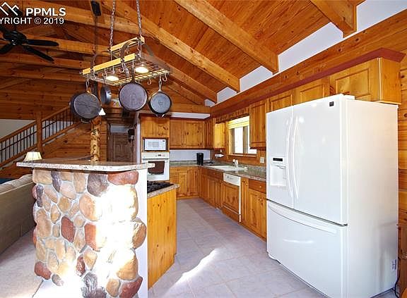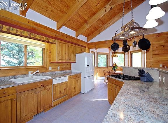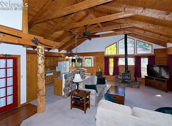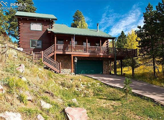 Now this is mountain living!! Welcome home to this gorgeous Tennessee Pine log home with Pikes Peak views!! Walk in the front door and enjoy the open concept large living, dining and kitchen great for entertaining with access to the large 26x14 deck facing Pikes Peak. The main floor boasts gorgeous vaulted log beamed ceilings with southern facing windows to enjoy the million dollar view. Downstairs you will find another family room complete with a Browning Prosteel gun safe with dehumidifier on a concrete pad bolted to the floor. The garage offers an extra storage room/man cave area and workshop with plenty of shelving. Outside you are surrounded by pine and aspen trees and the side yard is completely fenced in. The home is located on the edge of Woodland Park close to shopping, schools, restaurants, entertainment and 15 miles to Colorado Springs!
