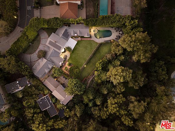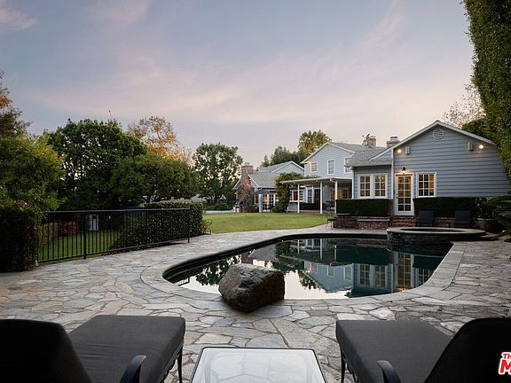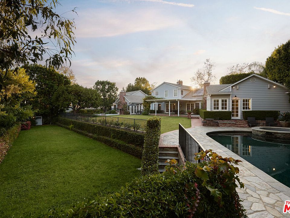 Celebrity compound on 1 acre south of Sunset - private, gated, and expansive. Beyond double gates and twenty-foot hedges, 196 Granville Avenue reveals a rare Brentwood estate with an unmistakable sense of history and presence within the neighborhood. A sweeping semi-circular driveway introduces the Cape Codinspired home, where dappled sunlight filters through mature trees and the facade recalls the elegance of a Hamptons summer home, reimagined for Southern California living. Inside, the chandelier-lit foyer opens to formal living and dining rooms designed for entertaining, complemented by original hardwood floors and light-filled spaces that flow effortlessly between one another. The kitchen, envisioned for daily gathering, showcases a central island, open shelving, and a breakfast banquette overlooking the gardens. Adjacent, the family room captures the home's character and warmth with vaulted wood-beamed ceilings, a stone fireplace, and French doors that open to the backyard. The main-level primary suite includes its own fireplace, dual-entry walk-in closet, and a serene bath with soaking tub, shower, and direct access to the pool. A secondary en-suite completes the first floor, while the upper level offers two additional bedrooms and a shared bath. Above the three-car garage, a private space with its own ensuite and walk-in closet provides endless possibilities for a gym, home office, or maid's quarters. Outdoors, the property unfolds like a hidden resort across a series of terraces and gardens that feel almost otherworldly in their privacy. Stone walkways meander through lawns and vine-draped verandas, leading to a pool and spa framed by mature trees. A lower path descends to a secluded lawn secondary flat yard for a sport court or pavilion. Further along, trails weave through the estate's own park-like terrain, leading to a grotto bar beneath a waterfall and a creek bordered by redwoods. A two-bedroom, two-bath guesthouse completes the estate, offering a full kitchen, living and dining areas, ideal for multi-generational living or an income opportunity, with a private entrance for independence. Held by one of television's most beloved figure for nearly thirty years, 196 Granville Avenue represents a piece of Hollywood history and a once-in-a-generation development opportunity to own one of Brentwood's most private, character-rich compounds south of Sunset.