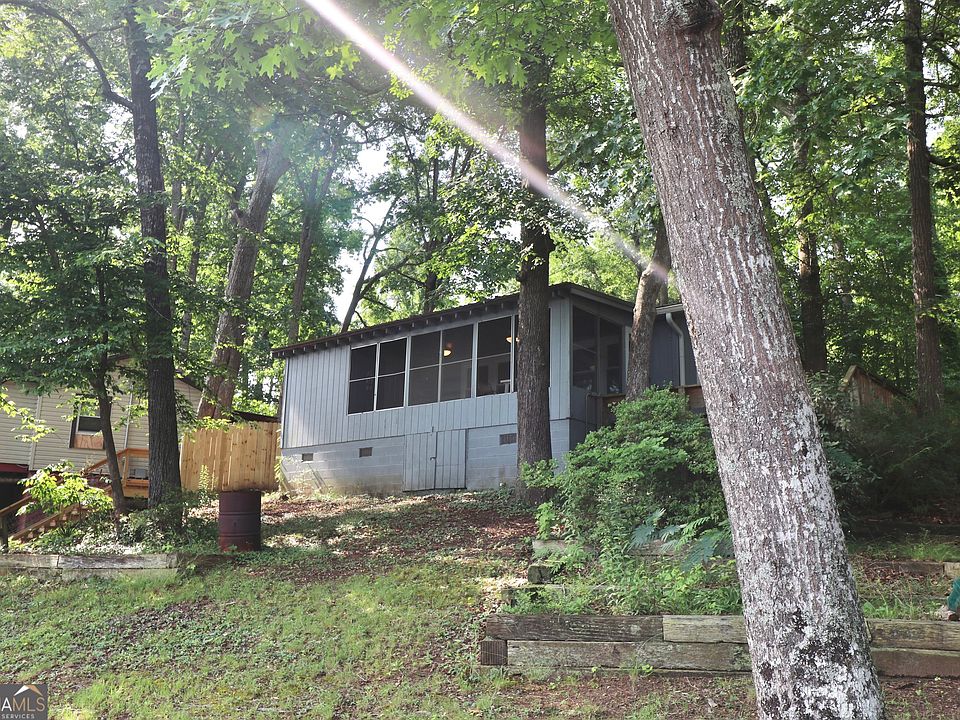 Enjoy beautiful lake views every day! This home is perfect for first time home buyers, empty nesters, or use as a vacation home. The home is on deep water, with a large covered boat dock. Fully furnished bedrooms including 2 sets of bunk beds with mattresses, 1 full size bed with mattress, 3 bedside tables, 2 lamps. Home is total electric, propane tank can be removed. Laundry room is located on porch, key is in lockbox. New dbl pane windows installed in 2022, new concrete block steps/access to dock 2024, laminate floors 2022, kitchen remodeled with bead board, shelving , stainless steel prep area, and dining light 2022, new paint throughout 2022, 2 new ceiling fans added on screened in porch 2023, new storm door installed in 2022, and coded keyless entry. New range hood 2023, new refrigerator 2022, 1 futon full size, coffee table, dining table with 4 chairs and TVs stay. There are 2 outbuildings, deck with large built-in bench, charcoal grill stays. Concrete patio perfect for a fire pit. Call Janice at 770-584-3038 to schedule an appointment or to answer any questions.