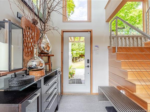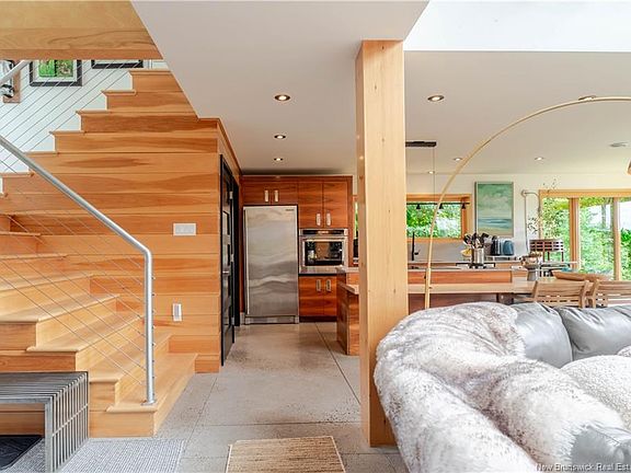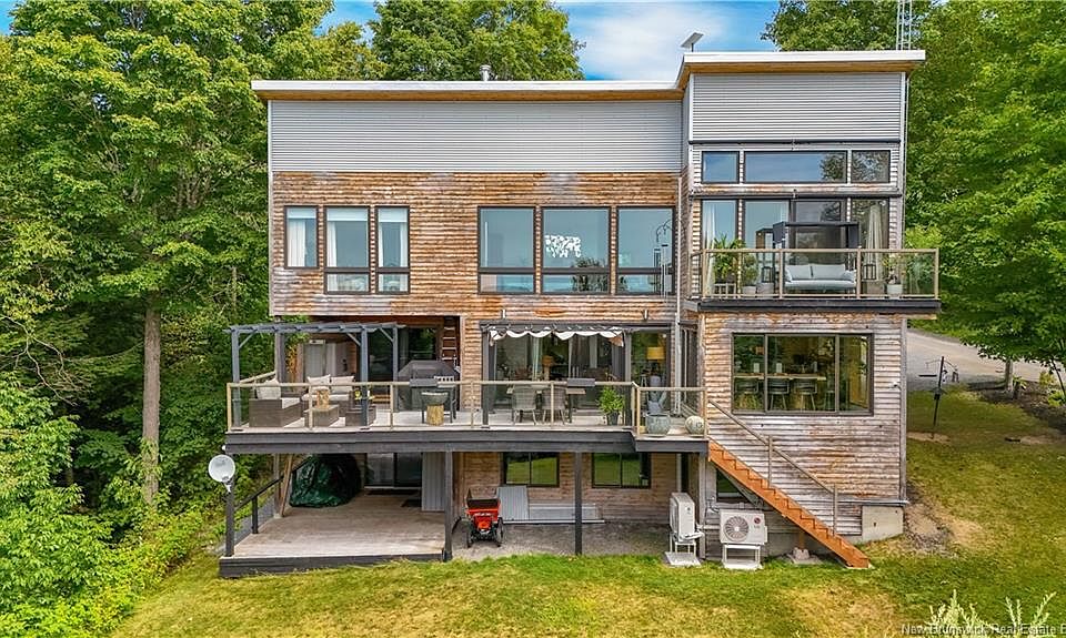 Exclusive eco-friendly architectural masterpiece by award-winning designer Krista Downey. This Passive Solar & Geothermal efficiency home is perfectly sited in scenic Heaven’s Gate Villa with spectacular views of the Mactaquac Valley & Head Pond, plus deeded access to the Mactaquac Arm. A private refuge, it reflects a modernist open-plan design with soaring vaulted ceilings, partial-height interior walls & polished heated concrete floors. Comfort is enhanced by 3 ductless splits for year-round efficiency. The chef’s kitchen boasts SS appliances, rich walnut cabinetry, solid maple block island with quartz counters, open to split dining/living areas highlighted by a striking HE wood-burning fireplace. The main level features a theater room with patio access to a covered deck, a convenient guest bathroom and laundry area, and a stunning private family room with fireplace, walkout to a side patio, and views of the treed/rocked landscape with its own peaceful waterfall. The upper level offers a luxurious master retreat with sweeping valley views from its sundeck, spa-inspired ensuite with walk-in ceramic shower, 2 more bedrooms, full bath & study. The lower level includes a gym, full bath, plus 3 additional bedrooms. Exterior features cedar siding & corrugated steel, metal roof & glass panel deck. The grounds are private & enchanting, a brilliant design blending sustainability, beauty & serenity.