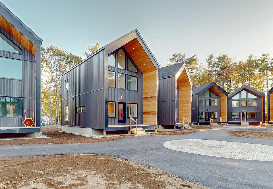 The architectural design of each residence within Wilbur's Woods reflects a refined Scandinavian ethos, where the elegance of minimalism meets the warmth of home. The exteriors boast a bold, dark palette, allowing the homes to mesh into the beautiful Maine landscape, while recessed lighting creates a welcoming ambiance that captures the serene essence of the twilight hours. The homes feature a covered front deck, offering residents an outdoor sanctuary that also serves as an inviting threshold between the tranquility of home and the bustling community beyond.