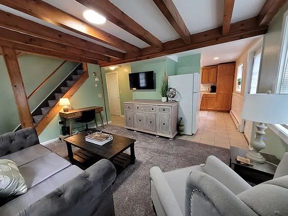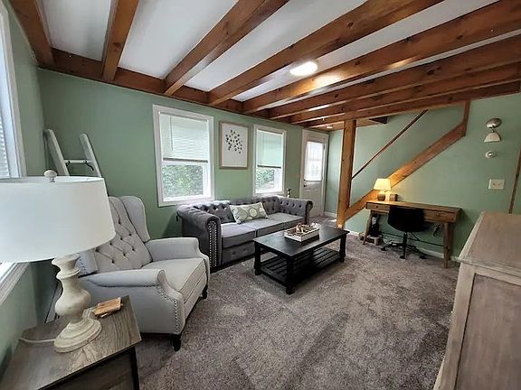 Back deckEat-in kitchenShed for storageExposed beamsComfortable living spacesWall to wall carpetTons of natural light
