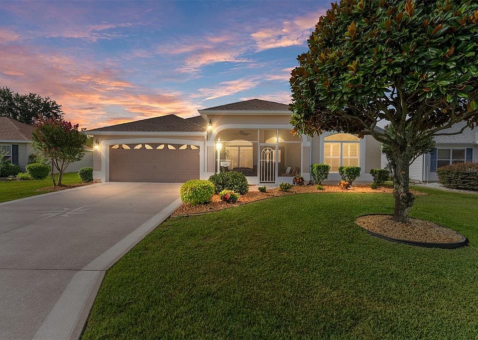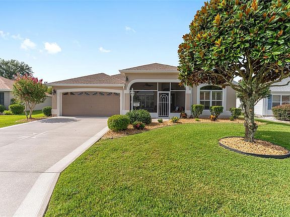 NO BOND - 2-YEAR American Home Shield Warranty offered – Close to Publix, COSTCO, Walmart, Restaurants & Banks. You've been looking for a Designer Model (Expanded GARDENIA) with Premiere upgrades and is priced to sell! Look no further as this desirable model in a very convenient location near LAKE SUMTER LANDING and Hwy 466! Updated and replaced - ROOF 2021, HVAC & WATER HEATER - 2019, and NO BOND!! Freshly painted inside and all tile has been professionally cleaned - MOVE IN READY and NO CARPET! Residents love the Gardenia for its open floor plan and split bedrooms for added privacy, and what makes this home UNIQUE is the LARGE FRONT SCREENED PORCH! The curb appeal is so inviting with a recently painted exterior/trim, painted driveway, and manicured trees and shrubs. You initially enter a large Screened Front Porch (165 sf) which allows for relaxation amidst the beautiful landscaping or entertaining guests. As you enter the home you'll notice the vaulted ceilings, round wall corners and other luxury upgrades. There is extensive CROWN MOULDING and PLANTATION SHUTTERS throughout this home. There are TWO SOLAR TUBES, updated Ceiling Fans and Fixtures and NO POPCORN CEILINGS. The kitchen boasts beautiful CORIAN countertops, updated Cabinets, and newer STAINLESS STEEL appliances. There is updated kitchen lighting and ROLL OUTS in the kitchen cabinets for easy access. As a bonus, there are GAS HOOK-UPs for the stove and the clothes dryer! The Dining/Living Room area is extra large for entertaining and comfortable seating with a gas fireplace for ambiance. The Primary Bedroom has beautiful laminate flooring, a vaulted ceiling, two walk-in closets and a large en-suite with an updated walk-in shower and DOUBLE SINKS. The guest room has an Oversized Closet and is very inviting and bright. The 3rd bedroom or den (no closet) is set up as an oice and has a Murphy Bed for additional guests. There is a convenient bathroom between these two bedrooms as well as a linen closet. Wait until you see the Florida Room, which provides extra space for whatever uses you may have as it seamlessly transitions from the living area and adds extra square footage. There is a door which leads out to the back porch with Privacy and an ELECTRIC AWNING for shade and comfort. The Laundry Room with a newer Washer (2024) & Dryer (2015) and laundry sink leads to the Garage which has storage, attic stairs with decking and a whole house water filtration/softening system. The Irrigation control in the garage has been recently replaced with WiFi accessibility and there is a whole house surge protector. This home has been so well maintained and has been recently updated and refreshed! It is on a quiet street and in a very socially active neighborhood that you will just love! This location is a mile from Lake Sumter Landing for entertainment and dining as well as two pools, golf, and nearby Pimlico recreation center. The furniture/decor and golf cart are available with separate purchases. Look no further if you are searching for Homes for sale in a great location in The Villages, Fl. I can't wait for you to see it!!