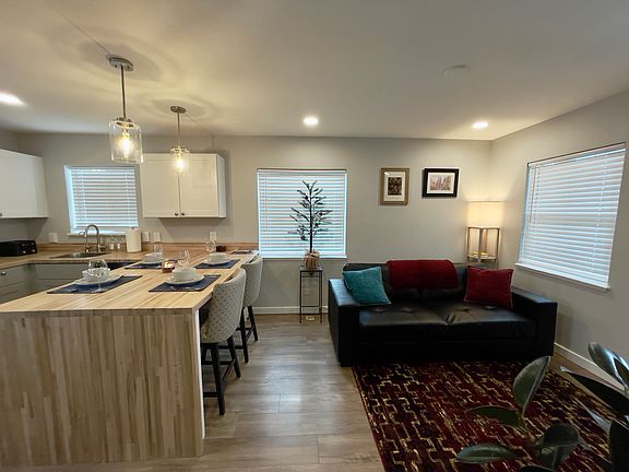 This unique home has been set up with style and comfort in mind! Fully furnished, conveniently located house equipped with a modern kitchen, and all new finishes. The primary bedroom has a comfortable king size bed and an oversized closet. The smaller bedroom has a day bed with a trundle.